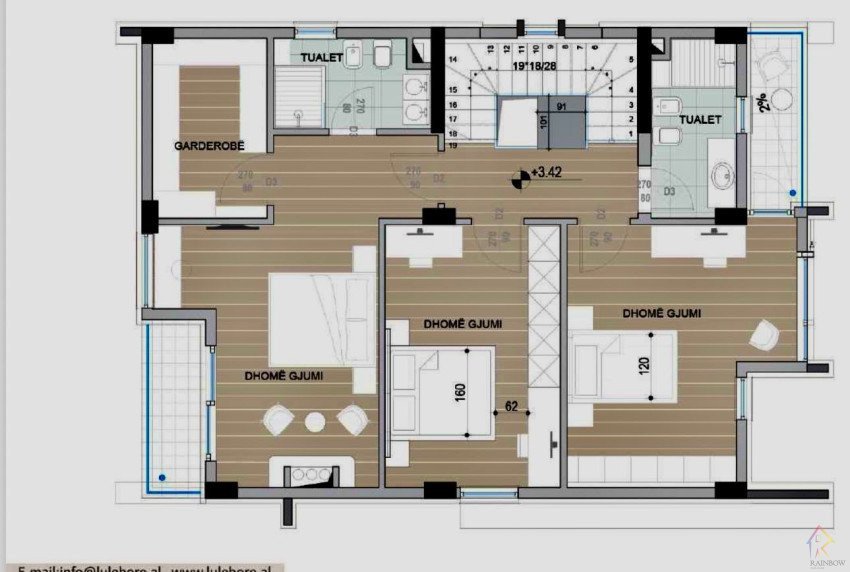 Kati i siperm perbehet nga 2 dhoma gjumi, ballkon, banjo ne korridor, dhome matrimoniale me garderobe dhe tualet te pervetshem.