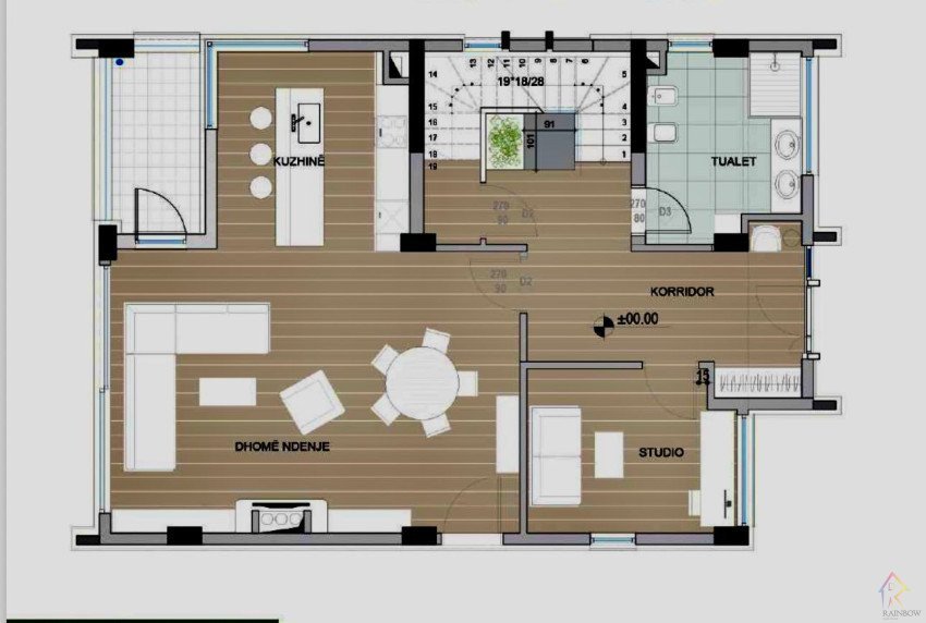 Kati perdhe perbehet nga korridori, studio, tualet,ambient ndenjeje, kuzhine+ambient ngrenieje.